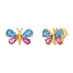 Brinco Borboleta Topázios Azuis Turmalinas Rosa Ouro 18k 750