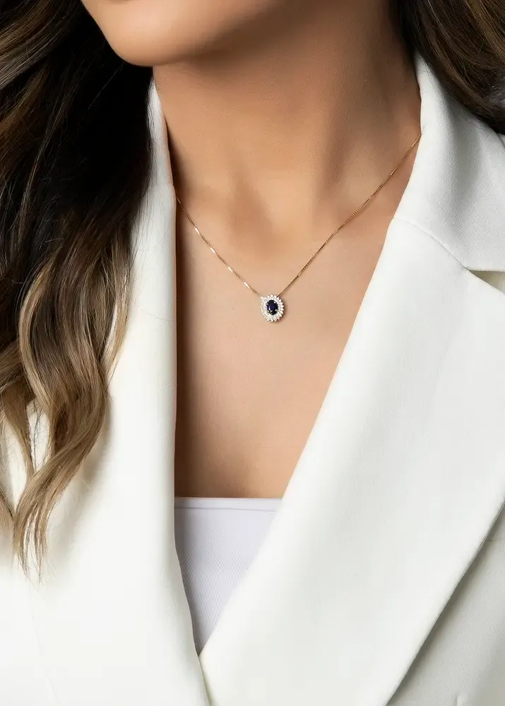 Gargantilha de ouro 18k 750 com safira e diamantes